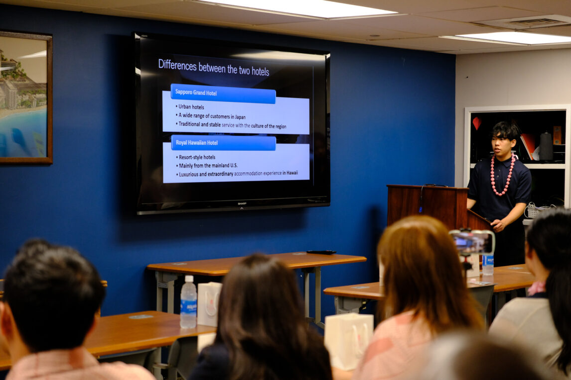【荒川】私はホテル業を担当し、札幌グランドホテルとワイキキビーチにあるRoyal Hawaiian Hotelを訪問しました。Royal Hawaiian Hotelでのプレゼンテーション時には、飲食からベッドメイクまで、さまざまな部門から20人近くのスタッフの方が見学に来てくださいました。日本とハワイのホテルを比較し、コロナ禍以降減っているハワイの日本人観光客を取り戻すために何ができるかというテーマでプレゼンテーションを行い、自分たちなりの提案もさせていただきました。質疑応答は突っ込んだ質問も多く、英語で答えることに苦戦しましたが、スタッフの皆さんが真剣に向き合ってくださっていることをありがたく感じました。